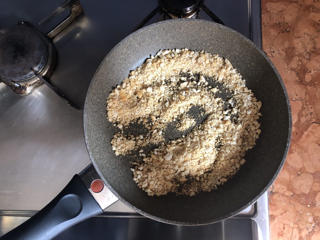 Heat a small pan and toast the taralli crumbs without any seasoning until they are golden and crispy. Remove them from the pan and set aside. If using simple bread, toast it with a drizzle of oil and season with a pinch of salt.