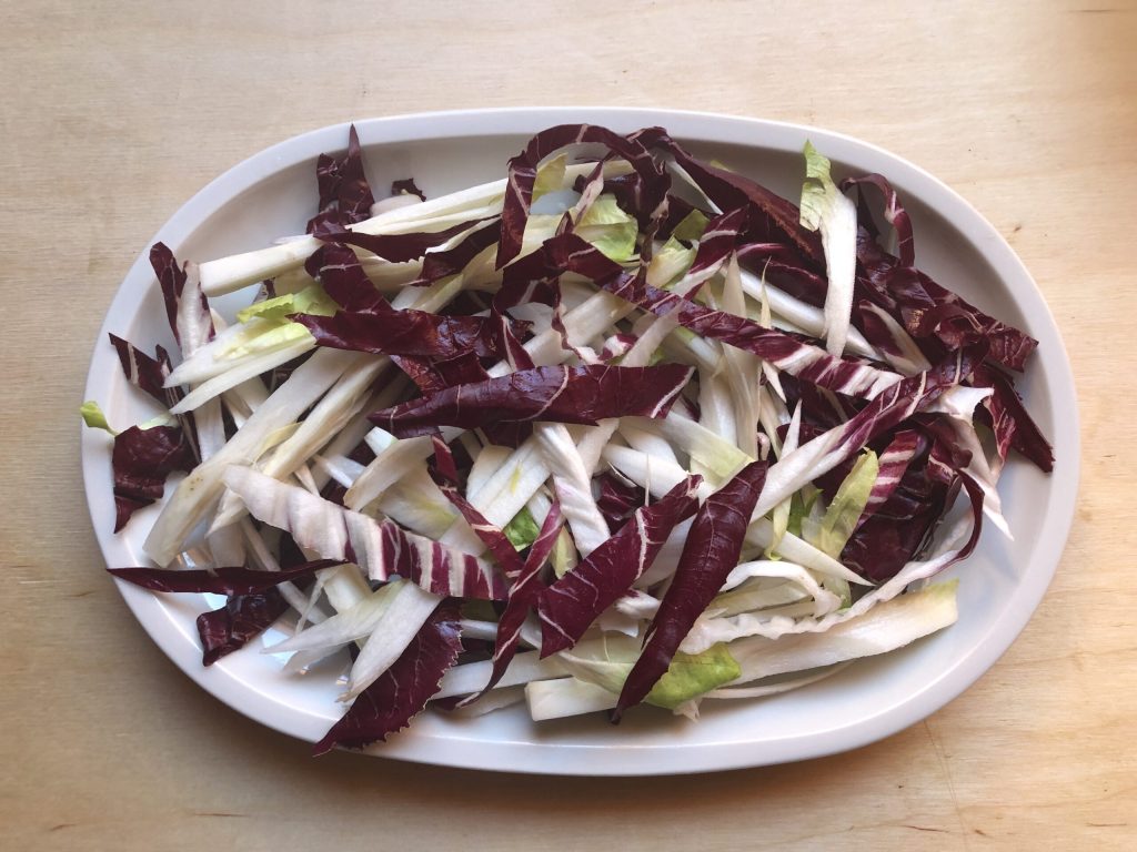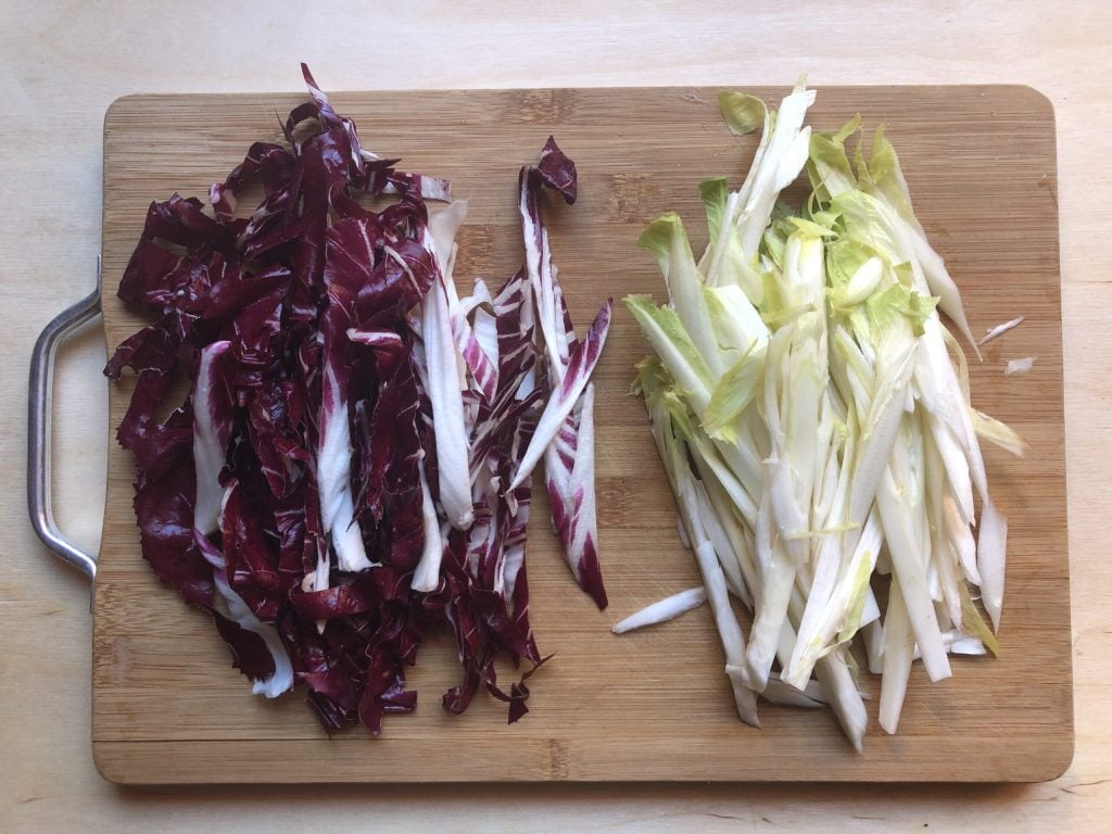 Arrange the radicchio and Belgian endive strips on a serving plate.