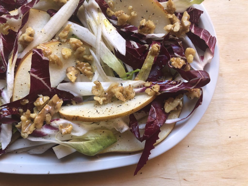 Dress the radicchio and Belgian endive salad with the prepared walnut vinaigrette and sprinkle everything with a generous grind of black pepper. Serve immediately! Enjoy! Paola