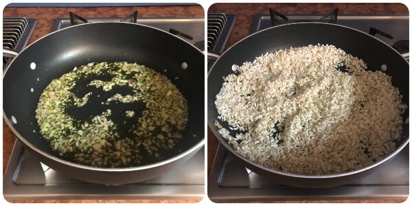 In a large pan, heat a few tablespoons of oil before adding the shallot. Let it sizzle for a moment, then add the rice and toast it for a couple of minutes.
