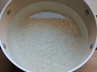 Pour the water into a saucepan and bring it to a boil. Then add the rice.