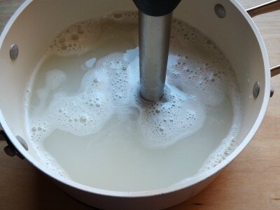 Reduce the heat to the lowest setting and cook for about half an hour with the saucepan partially covered: at the end, the rice should be overcooked. Turn off the heat and let cool slightly, then blend everything thoroughly with an immersion blender.