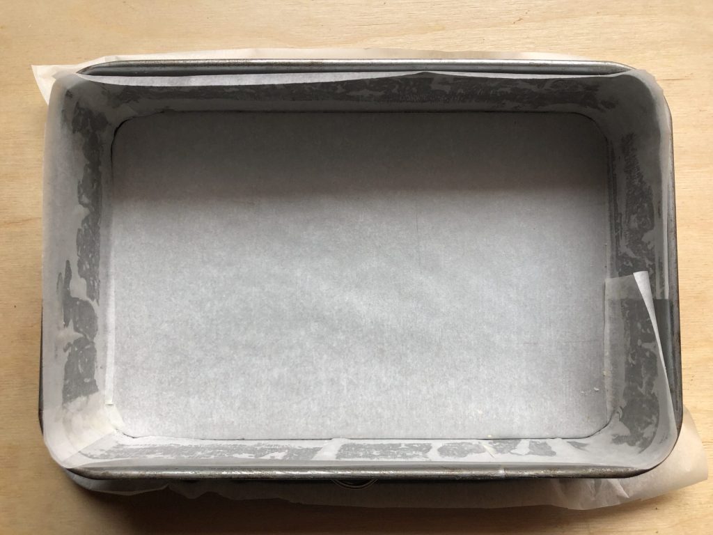 Line a rectangular baking pan of 11 × 7 inches with parchment paper. If you don’t have this type of pan, you can make a round cake using a 9.5-inch diameter mold. If, instead, you wish to purchase it, you can find it by clicking HERE.