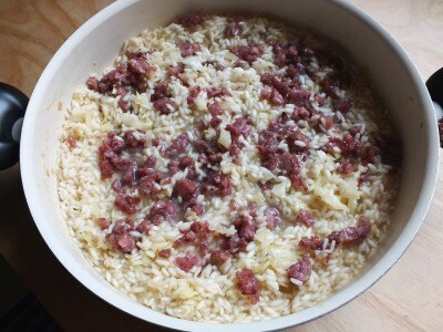 In the meantime, crumble the slices of cotechino into coarse crumbs and add them to the rice just before the end of cooking.