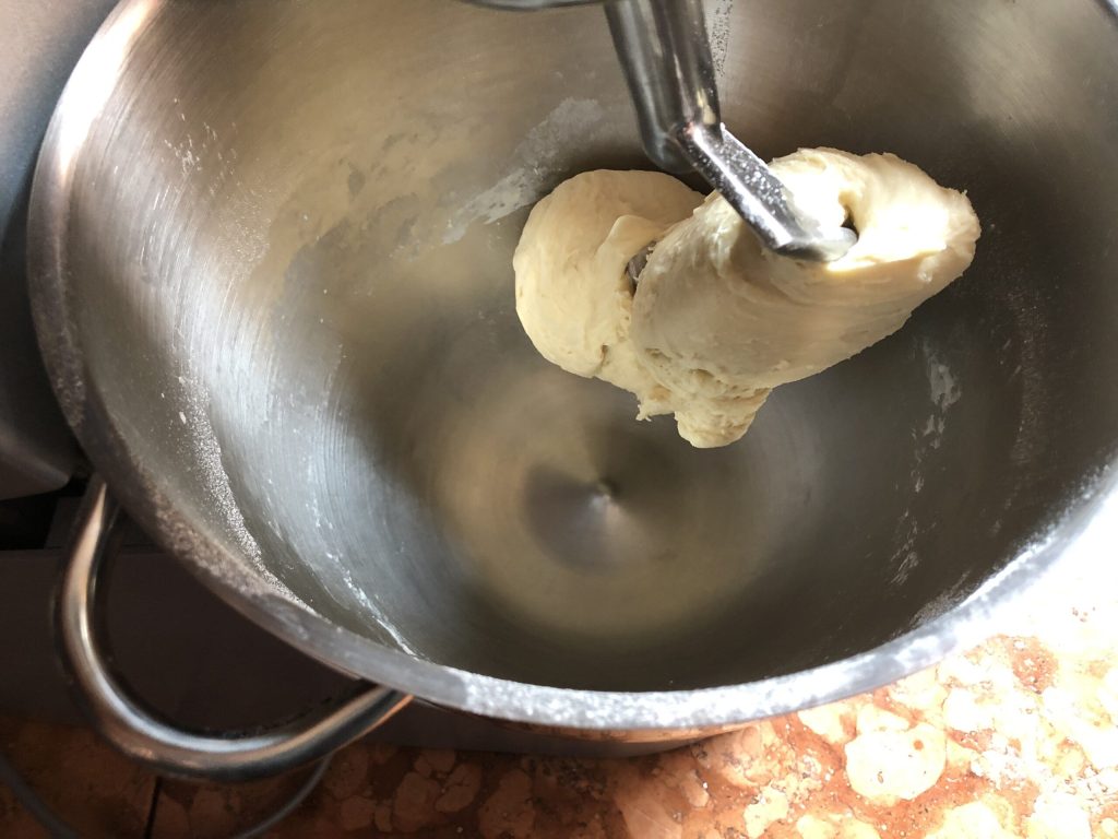 Now add the pinch of salt and keep mixing until you obtain a smooth and homogeneous dough that clings to the hook. If the dough is too hard, add a little milk. This can depend on the quality of the flour which affects liquid absorption.