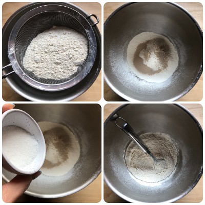 Sift the flour into the bowl of the stand mixer, then add the dry yeast and sugar, and mix with a small hand whisk. If you are using fresh yeast, dissolve it in warm milk before adding it to the flour.