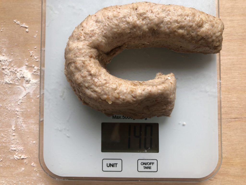 After this first rise, return the dough to the lightly floured workbench and divide it into six parts, each weighing 140 g.