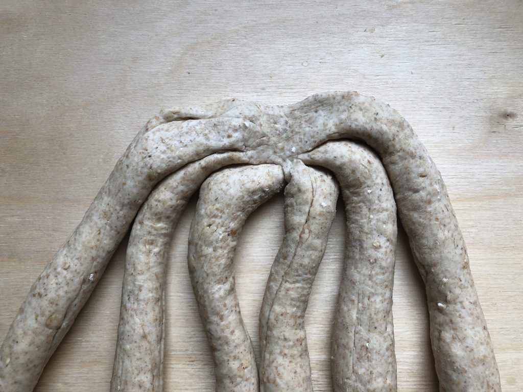 Now take the two outermost loaves and cross them inside while keeping the six rolls open. Proceed the same way to the end. I assure you it is easier done than said. Basically, you always cross the two outermost loaves.