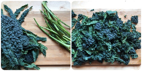 Remove the central rib from the Tuscan kale leaves, wash them under running water and cut them into large pieces. There is a very simple trick to quickly remove the rib from the leaves. I show it in a video you can find HERE.