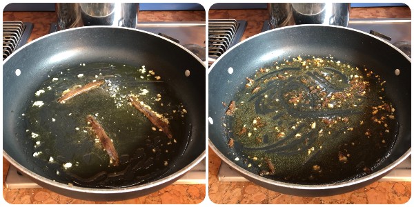 In a large pan, heat a few tablespoons of oil and sauté one clove of garlic finely chopped. When it begins to sizzle, add the anchovy fillets. Let them melt gently, crushing them with the back of a wooden spoon.