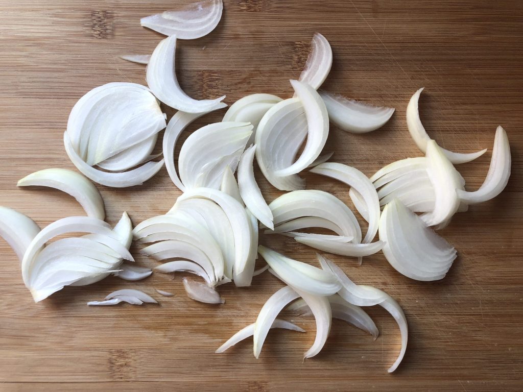 • Peel the onion, wash it, and cut it into wedges. You can use a white, golden, or red onion. I’ve tried all varieties over time, and it’s always good.