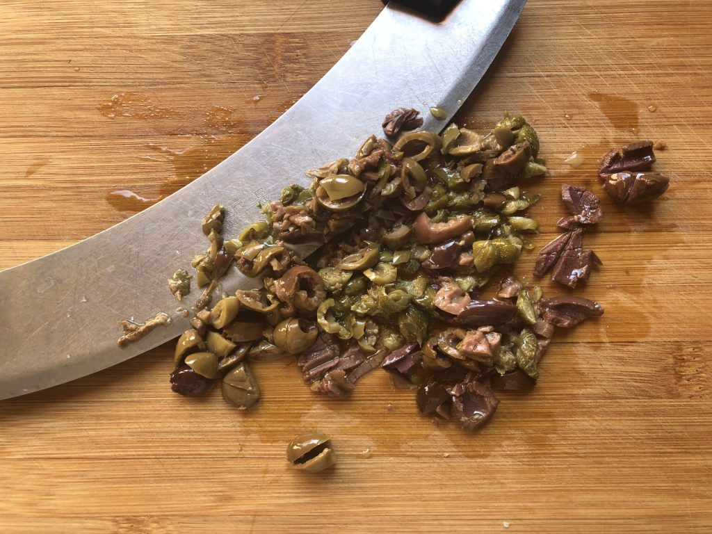 Coarsely chop the capers and Taggiasca olives as well. You can use capers in salt or vinegar. In both cases, I recommend rinsing them well under running water and patting them dry with paper towels.