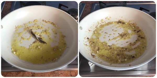 In a pan, heat a few tablespoons of oil before adding the minced garlic and shallot and a large anchovy fillet.