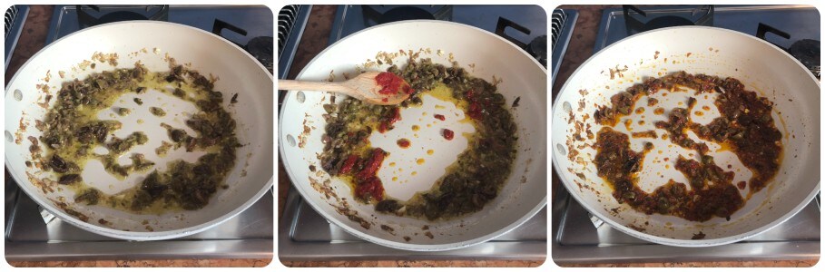At this point, add the chopped capers and olives and a generous tablespoon of tomato paste.