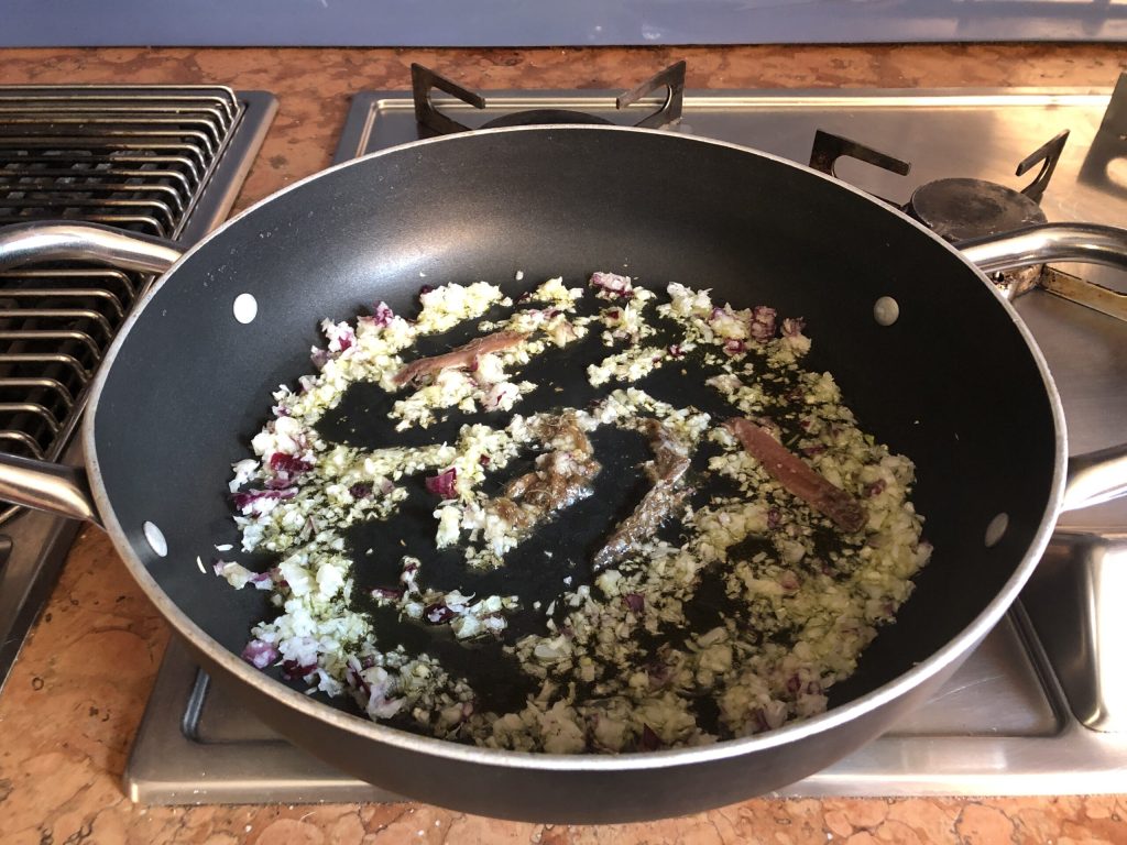 Using a mezzaluna, roughly chop the Taggiasca olives.In a large pan, heat a few tablespoons of oil before adding the spring onion. Let it sizzle for a few moments, then add the anchovy fillets and let them melt, crushing them with the back of a wooden spoon.
