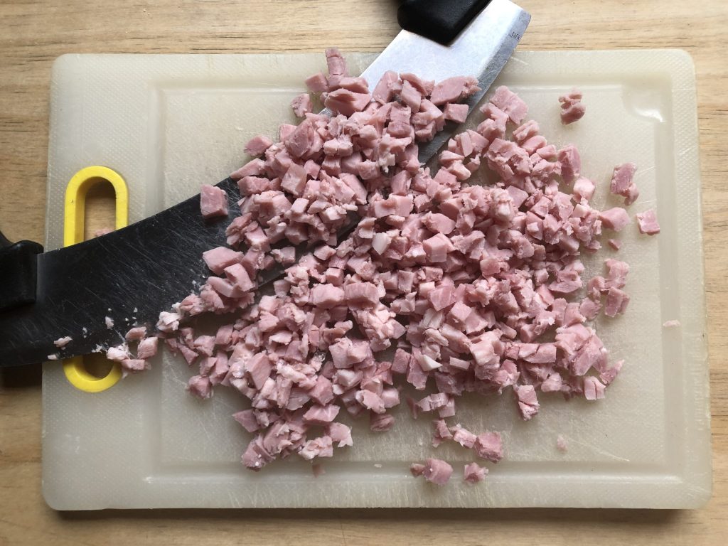 In the meantime, cut the cooked ham into small cubes. I further chopped them with a mezzaluna.