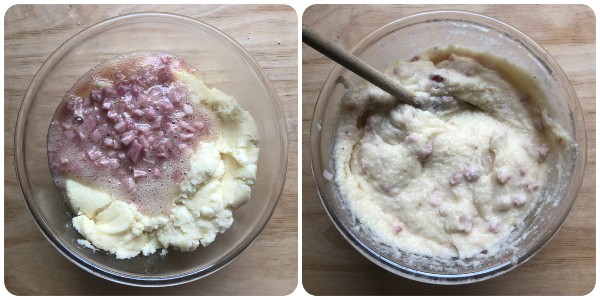 When the semolina polenta has cooled, pour in the egg and cooked ham mixture and mix well to combine all the ingredients.