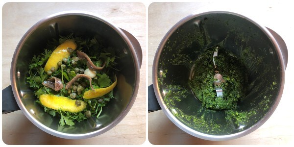 Then add the oil, capers, and anchovy fillets and blend until a thick cream forms. With the Bimby, I blended at speed 7, pausing several times to scrape the mixture toward the center.