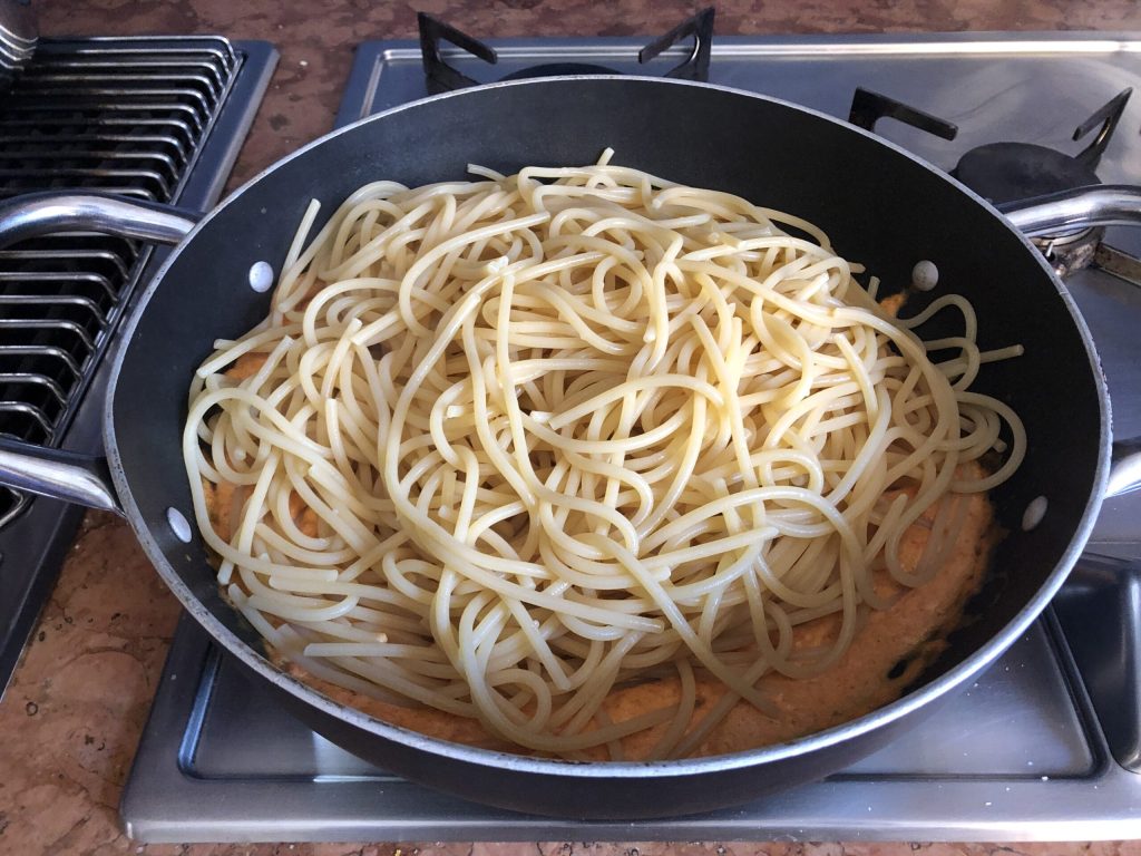 Meanwhile, boil the spaghetti in abundant salted boiling water, drain them al dente, saving some of their cooking water, and transfer them to the pan with the sauce.
