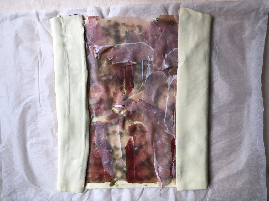 Unroll the rectangular puff pastry, keeping it on the parchment paper provided in the package, and brush with green (or black) olive pâté.