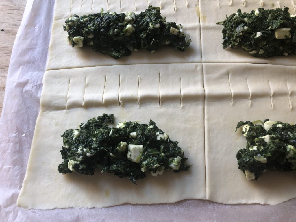Distribute some filling on the long side of each rectangle as shown in the photo. Try to evenly distribute the spinach mixture considering that you need to make 12 puff pastries.