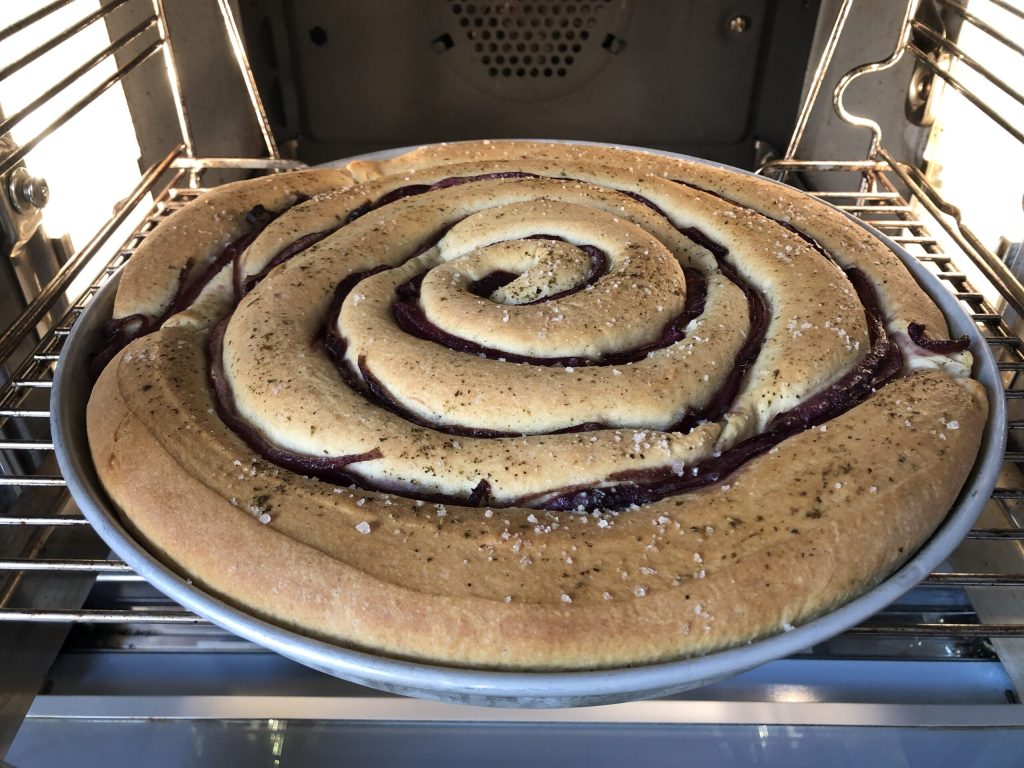 Finally, insert the now cooled onions between the coils. Cover and let rise for another couple of hours or until the focaccia has puffed up and covered the entire surface of the tray.