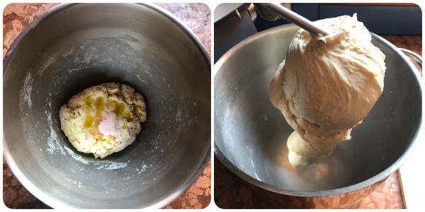 When the flour has absorbed the liquids and the dough starts to come together, also incorporate the oil and salt and continue kneading until it wraps well around the hook. You should obtain an elastic and homogeneous dough.