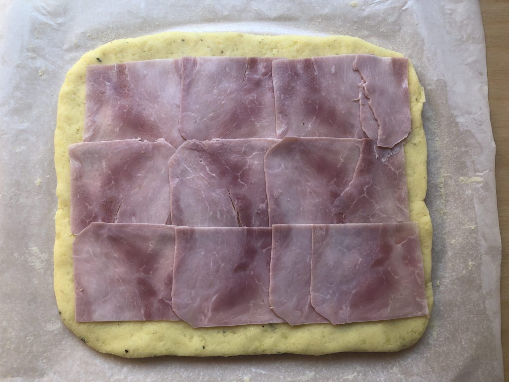 Arrange the slices of scamorza over the ham, then sprinkle everything with about 2 tbsp of grated cheese (about 20 g).