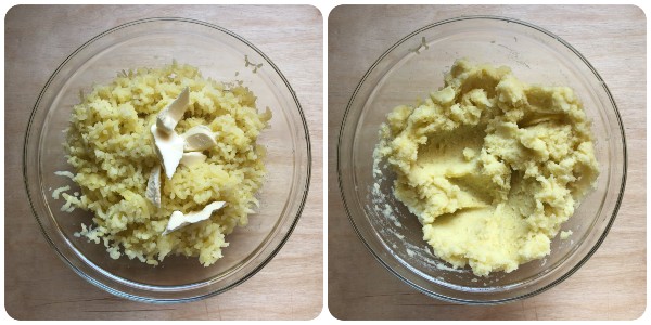 Immediately add the butter in pieces and mix it perfectly into the still-warm potato mixture (this will help it melt).