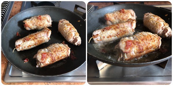 In a pan, heat a few tablespoons of olive oil before adding the four meat rolls. If you have some leftover prosciutto, tear it with your hands and distribute it here and there on the bottom.