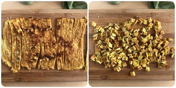 When it’s golden brown, remove from the pan and let cool; then cut it first into strips, then into cubes.