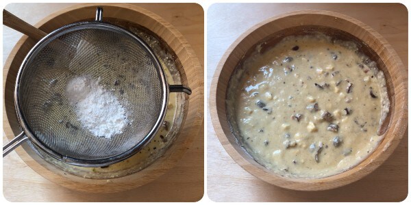 Then add the flour by sifting it through a fine mesh sieve and mix it with the eggs, softening the mixture with warm milk.