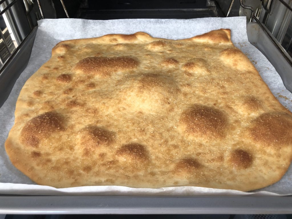 I prepared the dough for this sweet flatbread using a stand mixer, but you can easily knead it by hand, working the ingredients first in a bowl and then on the dough board.