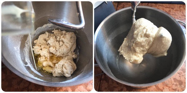 Once the dough has come together, add the oil and continue working until you have a smooth and elastic dough that clings to the hook.
