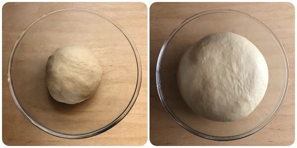 Transfer it to a lightly floured dough board, work it with your hands for a few moments, and shape it into a ball. Then place it into a large bowl. Cover with plastic wrap and let it rise until doubled in volume in a warm place away from drafts. The rising time depends greatly on the ambient temperature and can vary from two to three hours.
