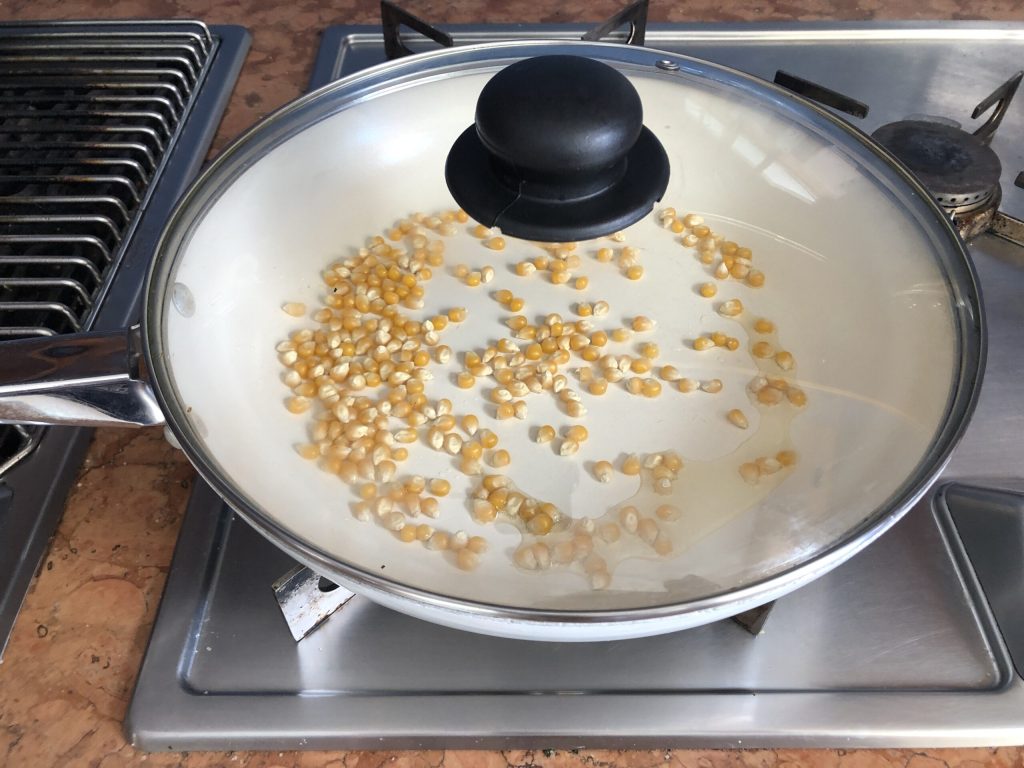 Heat a tablespoon of oil in a pan before adding the corn kernels, then cover with a lid.