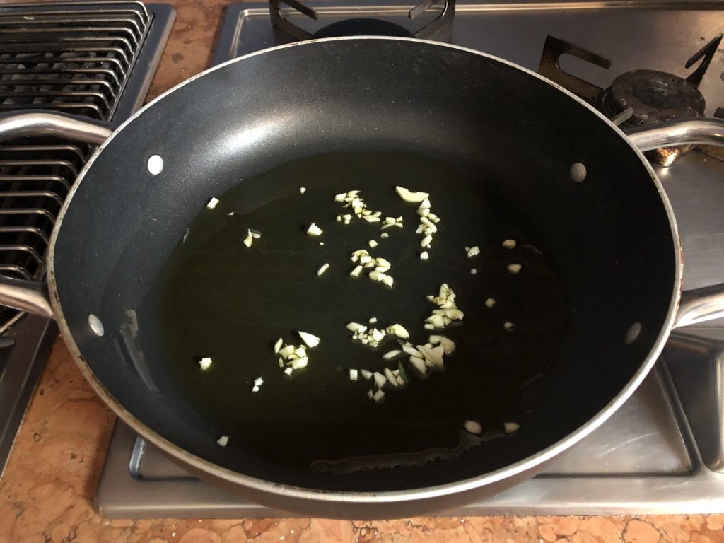 In a large pan, heat a few tablespoons of oil and brown the clove of garlic roughly chopped. If you don’t like garlic, you can leave it whole and remove it at the end of cooking.