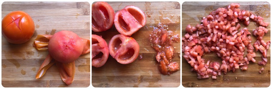 Meanwhile, wash the tomatoes, make a cross-cut at the base, and blanch them for a minute in boiling salted water. Drain with a slotted spoon and let them cool slightly.
