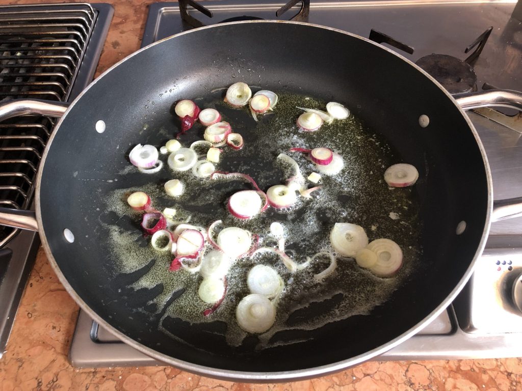 • In a large pan, heat a couple of tablespoons of oil and melt the butter, then add the green onions and sauté them for a couple of minutes.
