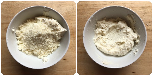• Meanwhile, place the ricotta in a small bowl, add a pinch of salt, a generous grind of black pepper, and the grated cheese. Mix with a spatula until you get a smooth cream.