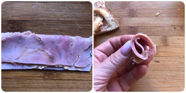 Place a bit of this cream in the center of each flower and on the tips and spread a thin layer also on a small rectangle of cooked ham.