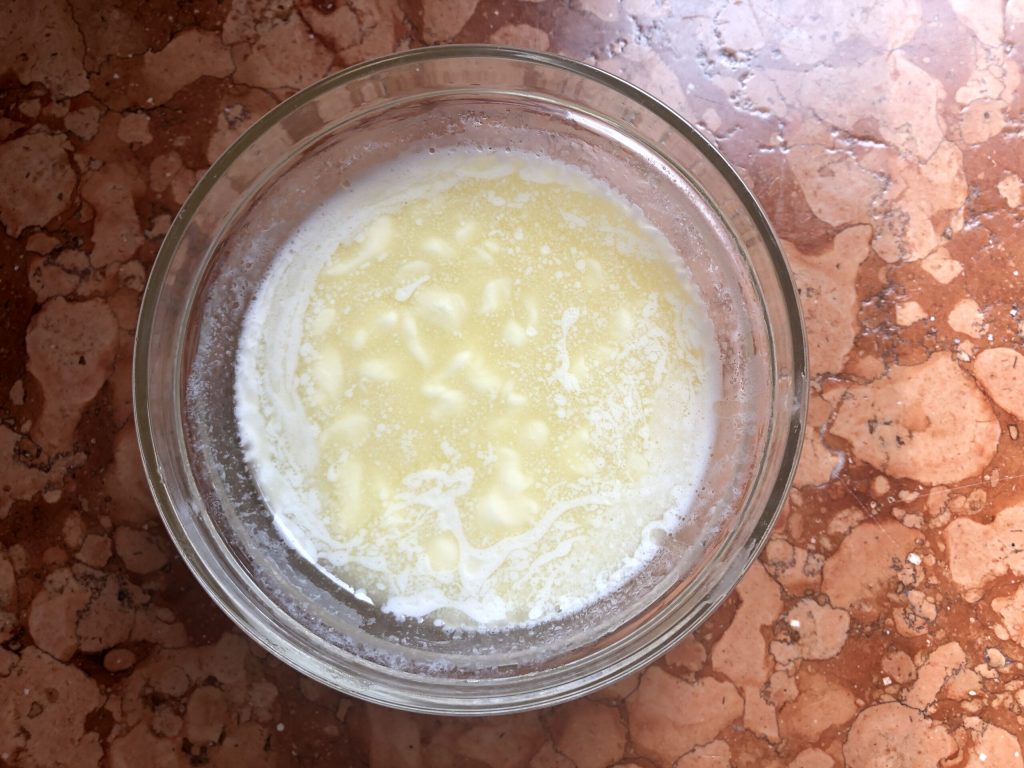 Add the milk and slightly cooled butter, and mix again with the beaters.