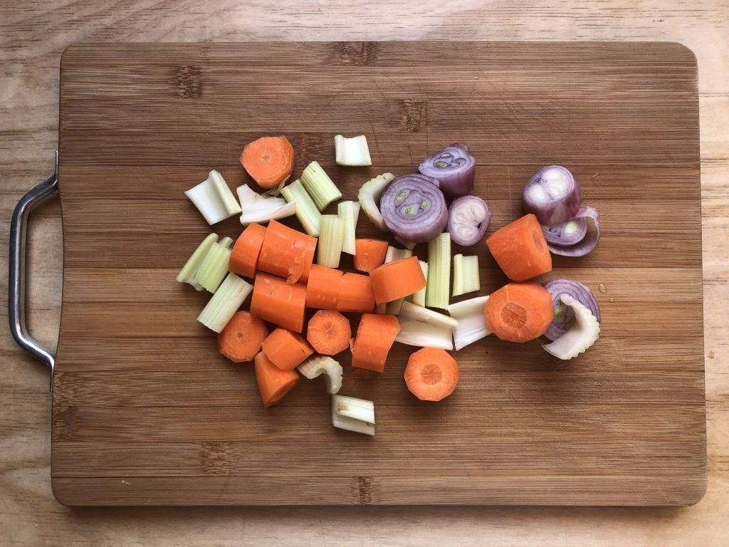Peel the shallot, scrape the carrots, and clean the celery. Wash these vegetables well and cut them into pieces.