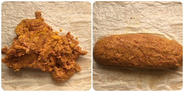 Transfer the obtained mixture onto a sheet of previously wet and squeezed parchment paper and shape it into a loaf.