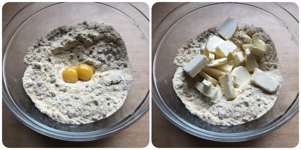 Then, add the two egg yolks and the softened butter cut into pieces.