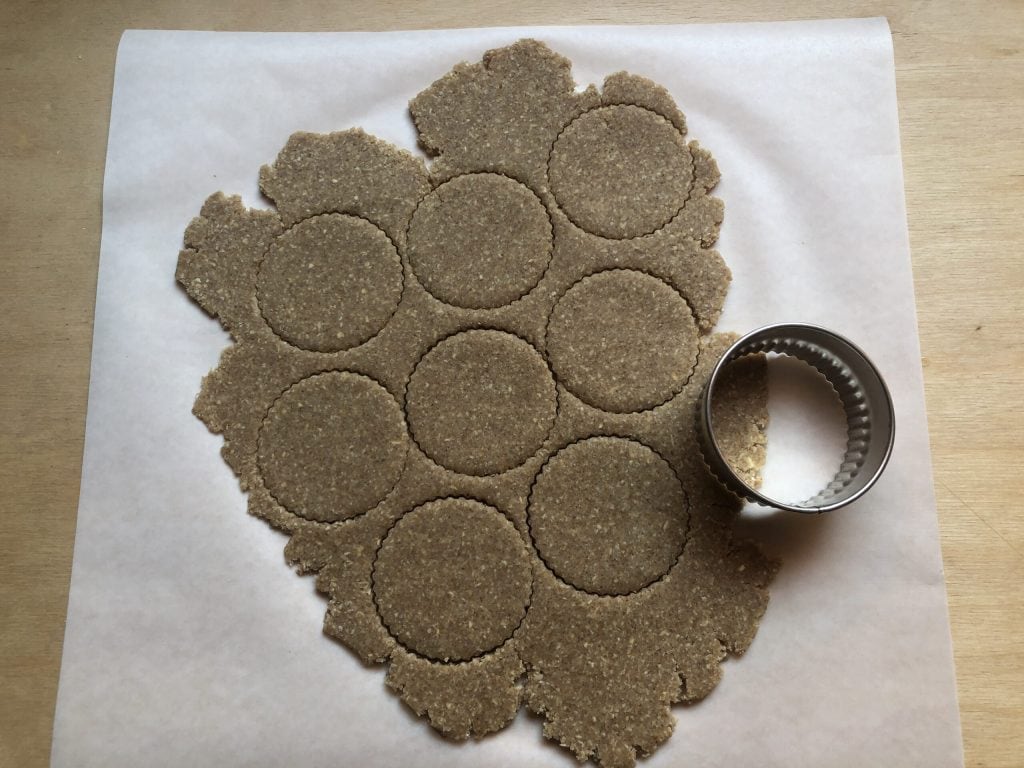 Using a round cutter with a diameter of 2.75 inches (a pastry cutter or a glass will do), cut out the first biscuits. Then knead the scraps again and proceed until all the dough is used up.