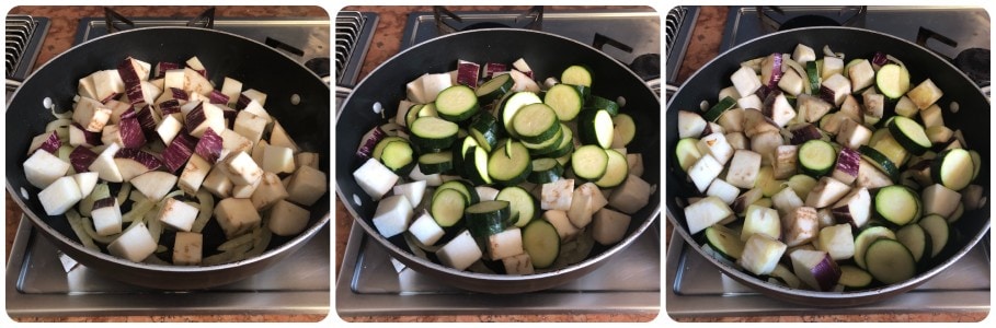 Then, add the eggplants and zucchinis, and sauté them for a couple of minutes, stirring often and maintaining moderate heat.