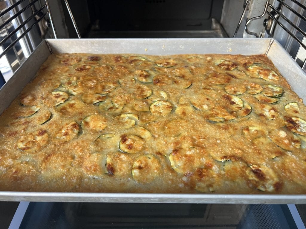 Bake the zucchini flatbread at 400°F for about 40/45 minutes (the cooking time, however, depends a lot on the oven and the consistency of the batter, so take it as indicative). If the surface browns too much, cover it with a sheet of foil in the last minutes of cooking. Sometimes this flatbread is perfectly cooked on the surface and softer underneath. In this case, extend the cooking time by a few more minutes with the lower coil turned on.