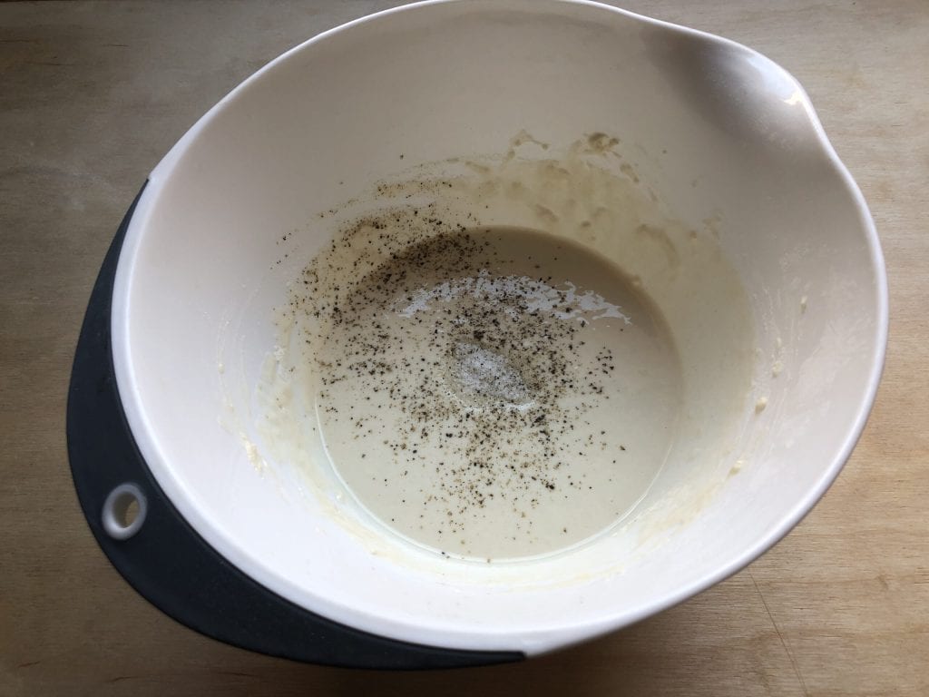Then add the flour by sifting it through a fine mesh sieve and mix vigorously with a small hand whisk (the amount of flour is somewhat by eye; you need to get a rather creamy batter).