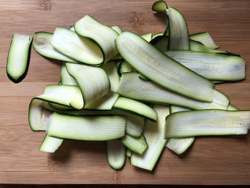 Trim the zucchini, wash them, pat them dry with kitchen paper, and slice them thinly lengthwise using a mandoline.